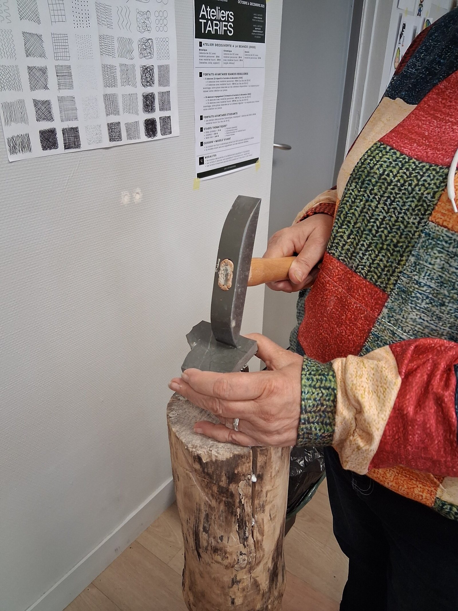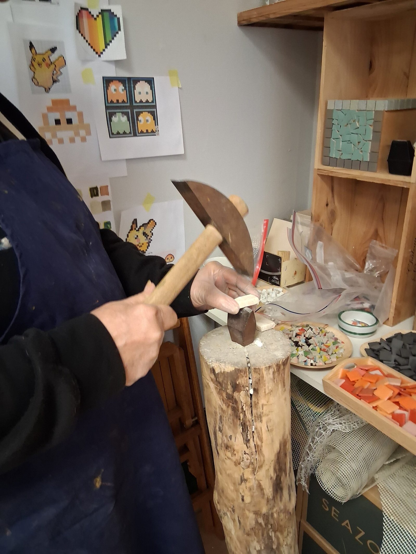 Mosaïque marteline et tranchet. Ateliers Mozaceram.