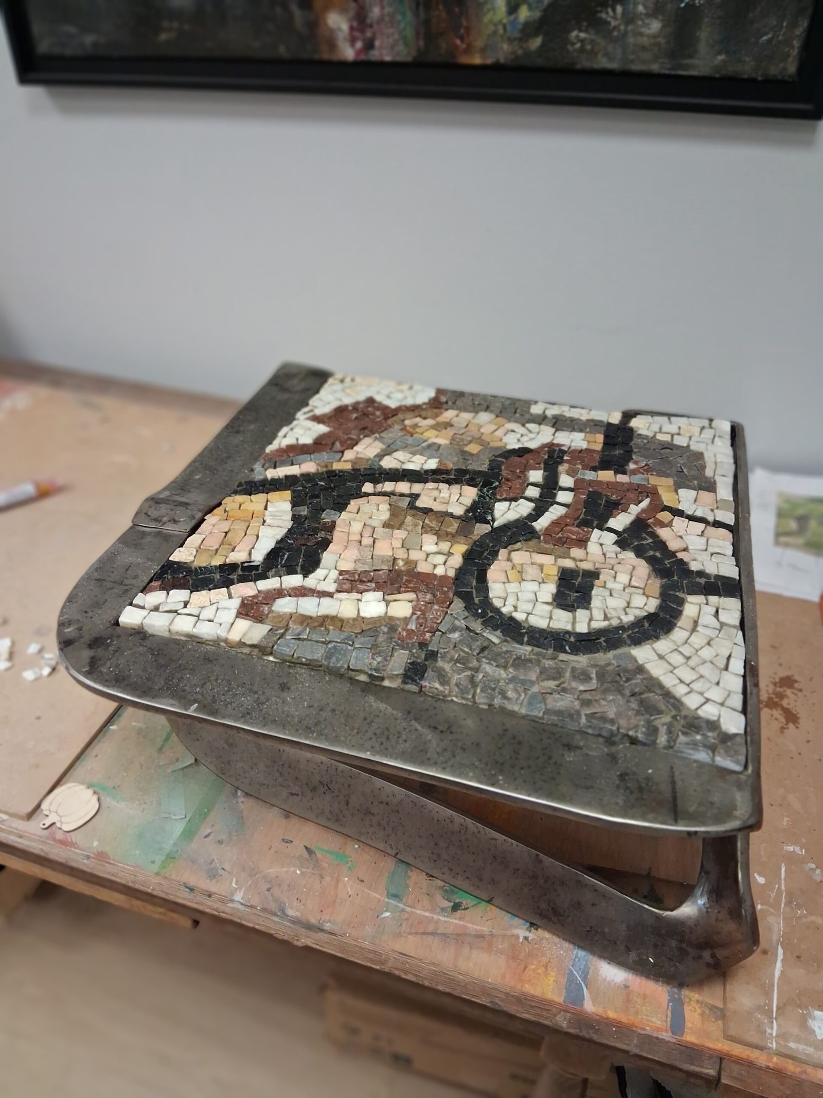 Restauration table en Mosaïque Lydia Steciuk. Pied en métal de l’artiste Didier Lebas.